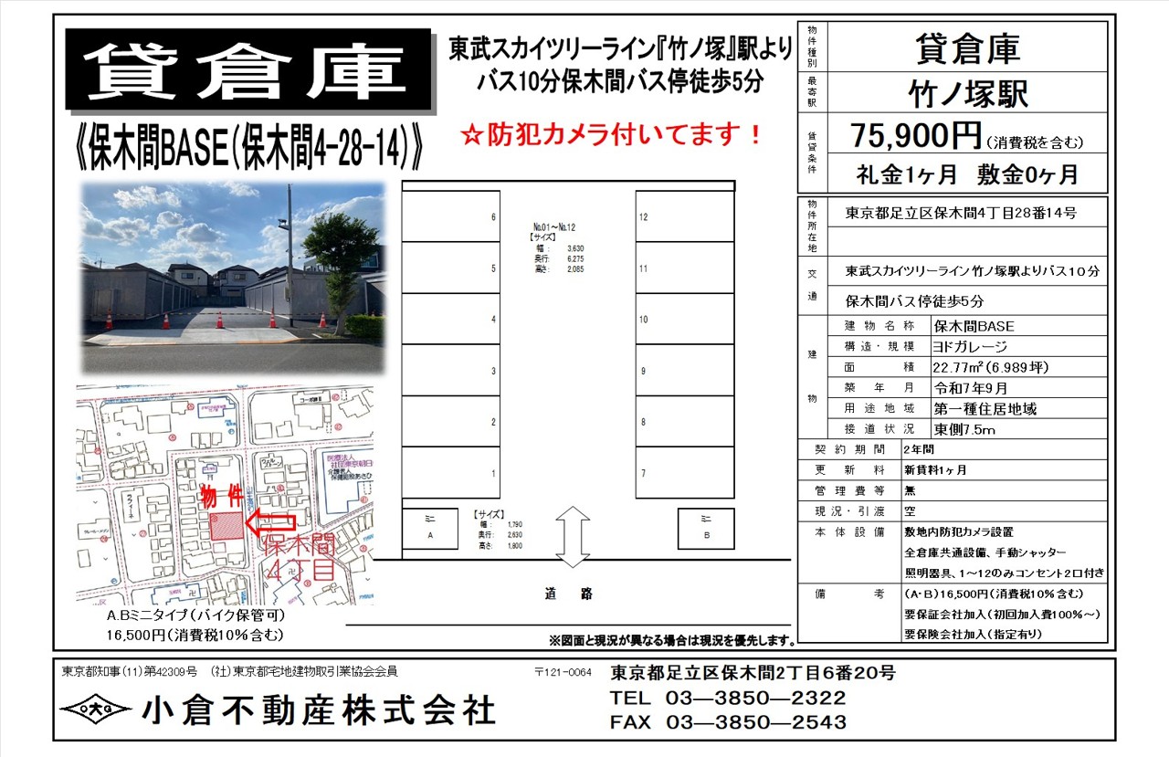 | 備考・制限等 | 敷地内図面参照 ・1~12(月額賃料75,900円 消費税10含む)サイズ横幅:3.630、奥行:6.275、高さ2.085 ・A.B (月額賃料16,500円 消費税10含む)サイズ横幅:1.790、奥行:2.630、高さ1.800 |